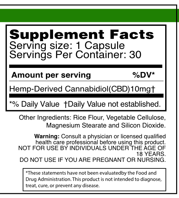 Ingredients: Hemp-Derived Cannabidiol(CBD), Rice Flour, Vegetable Cellulose, Magnesium Stearate and Silicon Dioxide.